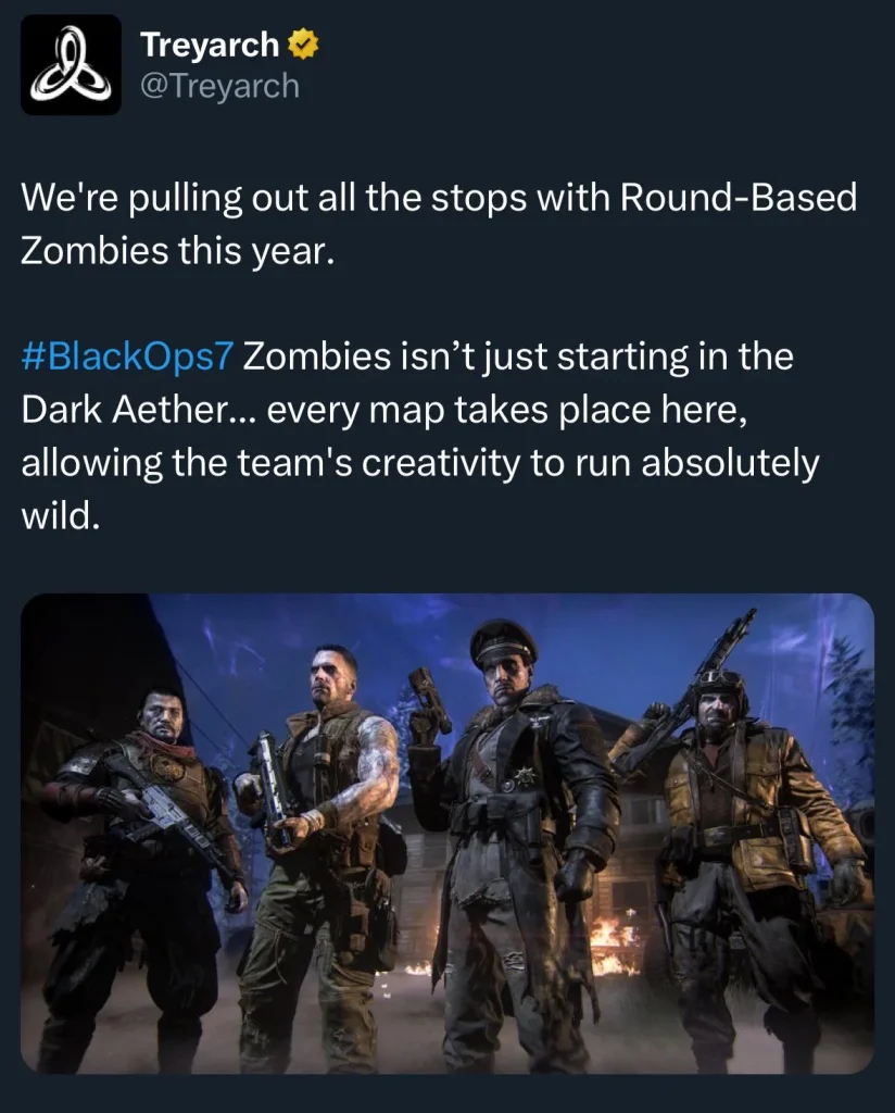 Story ties Dark Aether—third OG crew iteration (Richtofen, Takeo, Nikolai, Dempsey) mixes with BO6 faces. Questions burn: How’s the timeline twist? Easter eggs along roads hint deep lore, Menendez shadows lurking. It’s sequel fire, building BO2’s undead saga.